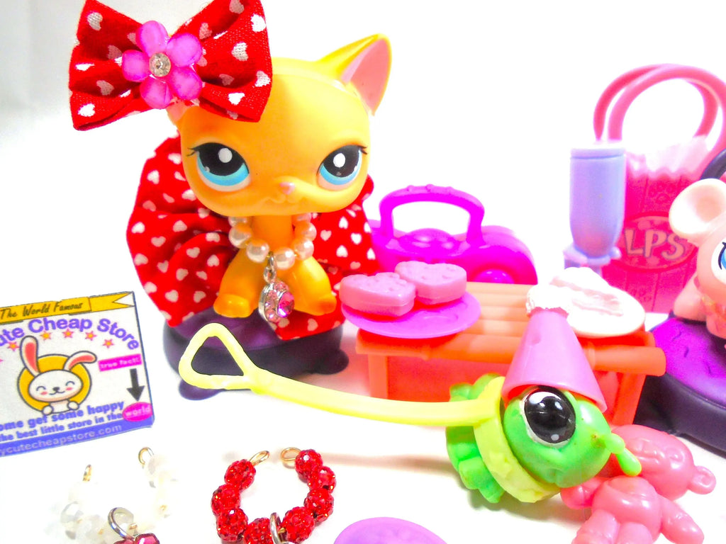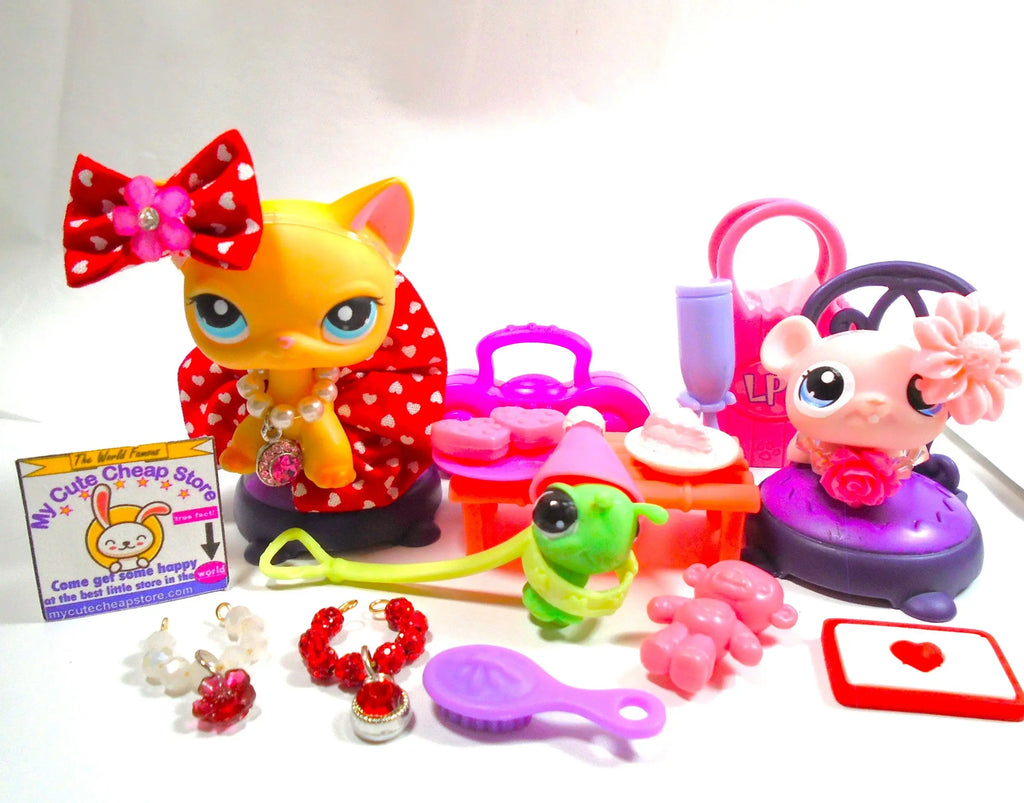 Littlest Pet Shop Valentine's Day Short Hair Cat Brooke #339 hamster #1371 with cute accessories